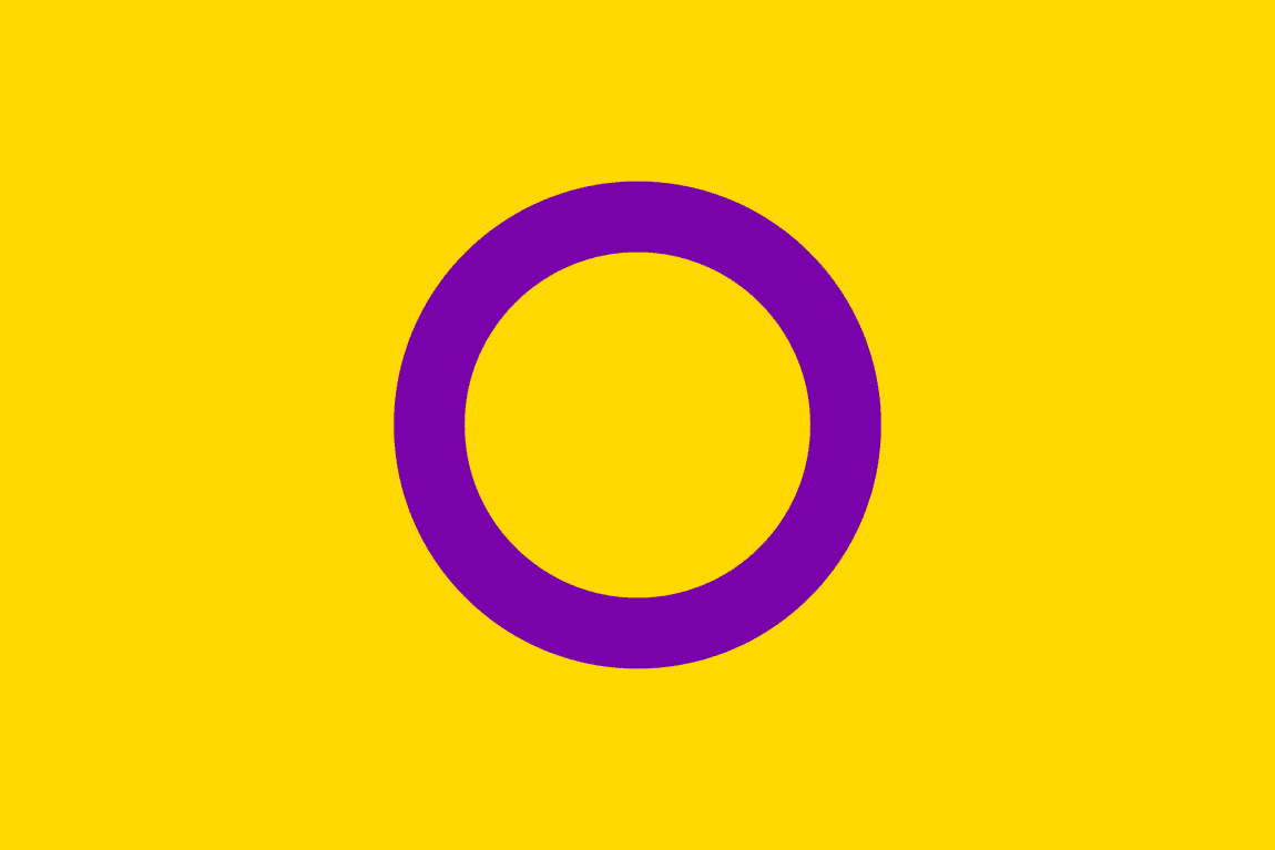Intersex Pride Flag designades av Morga Carpenter och Intersex Australia (tidigare OII Australia) 2013. Flaggan använder avsiktligt könsneutrala färger. Genom att blanda de traditionella färgerna som används för att representera binärt kön, blått och rosa, får vi lila. Den obrutna cirkeln ovanpå den gula bakgrunden representerar fullständighet, helhet och ens fulla potential.