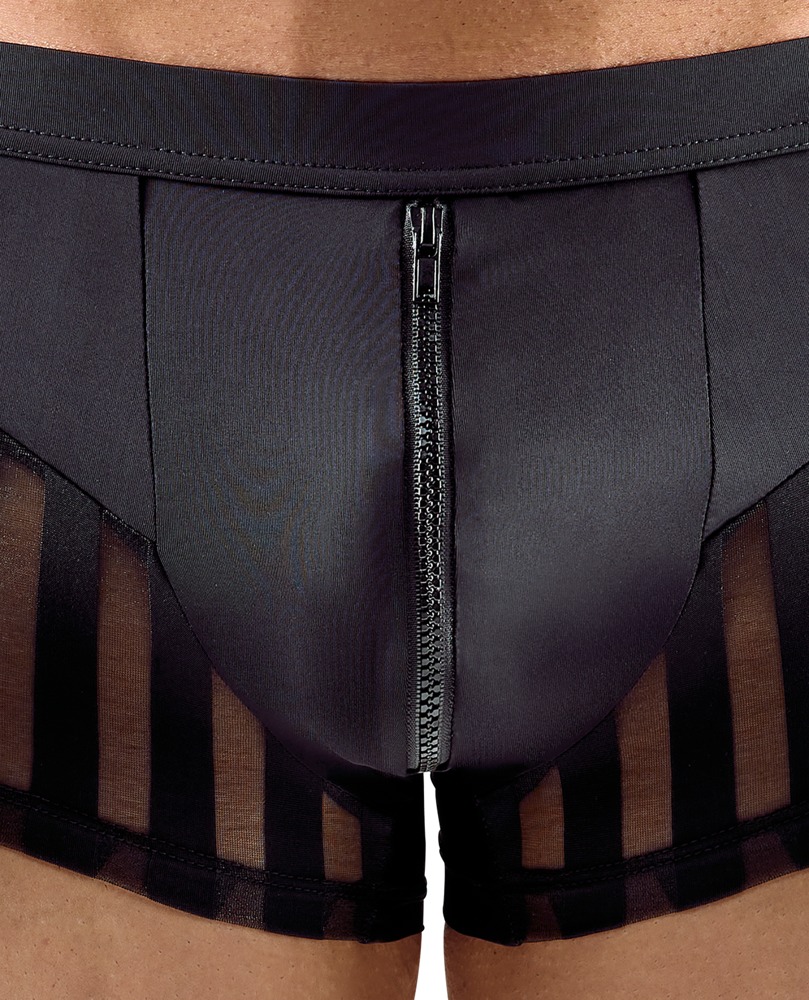 Byxorna är tillverkade i en högkvalitativ mikrofiber (85 % polyamid, 15 % elastan) som är mjuk, följsam och extremt bekväm mot kroppen. De är elastiska nog att röra sig med dig oavsett om du står stilla, dansar eller rör dig närmare någon... Materialet är lätt men ändå formande, vilket gör att dina konturer framhävs på precis rätt sätt. De transparenta ränderna – tillverkade i 90 % polyamid och 10 % elastan – ger ett visuellt spel mellan det synliga och det dolda, som kittlar fantasin utan att avslöja allt.