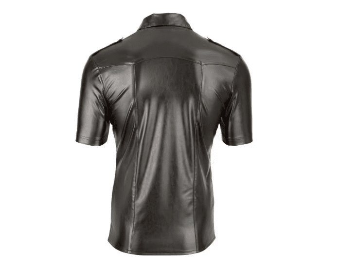 Den här skjortan i imitationsläder är inte bara ett plagg – det är en attityd. Med glänsande svart finish, klassiska epåletter, en bröstficka och en rad tryckknappar framtill signalerar den både kraft och stil. Den lätt insvängda midjan framhäver kroppen på rätt sätt och skapar en silhuett som får varje muskel att tala. Det här är skjortan du tar på dig när du vill kliva in och äga rummet – utan att behöva säga ett ord.